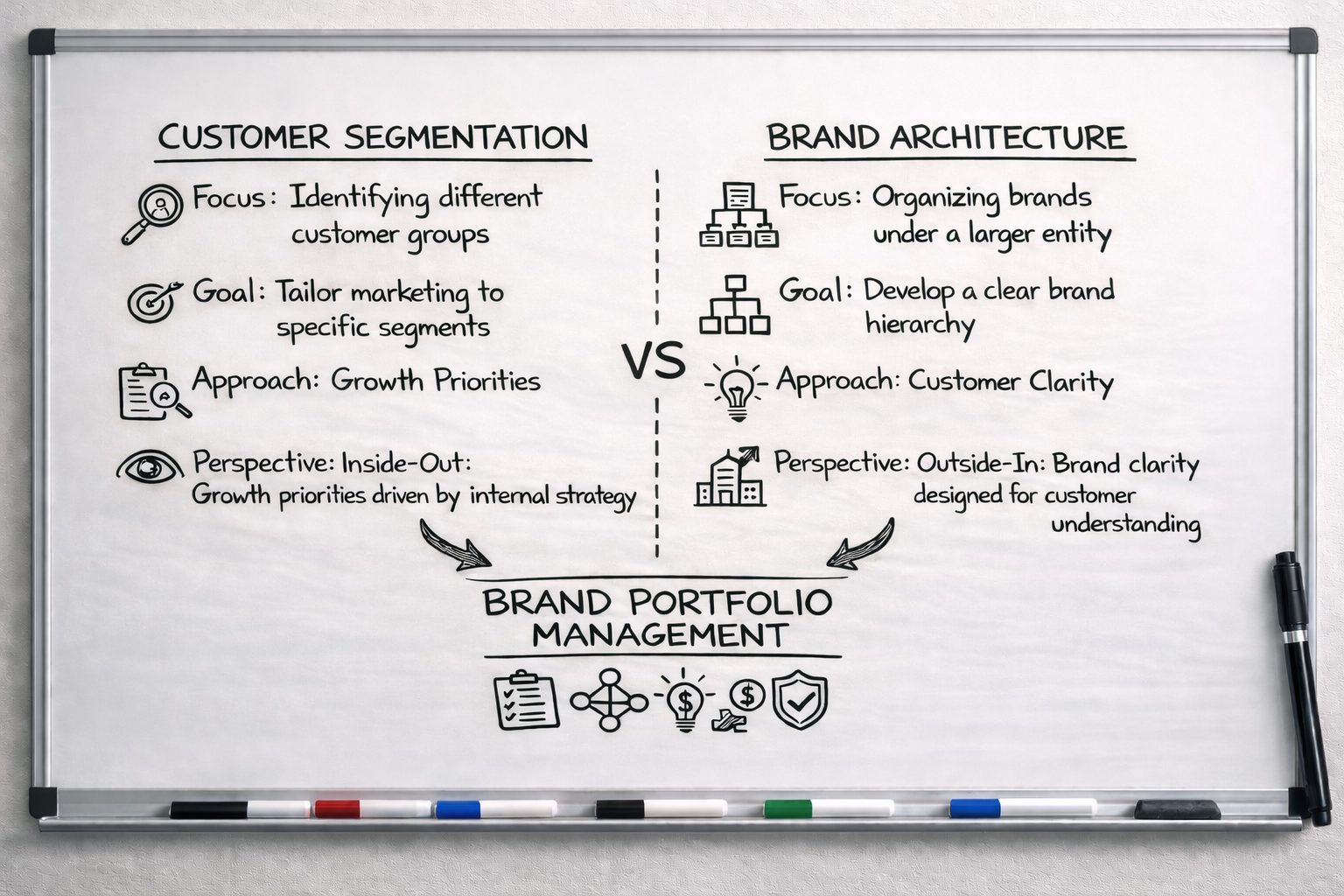 Customer segmentation identifies where an organization should compete. It is typically inside-out and growth-led, clarifying priority audiences, unmet needs, and opportunity spaces. Brand Portfolio Management translates these insights into brand-level decisions. It ensures that segmentation of choices and brand structures reinforces one another, rather than creating overlap or confusion. This integrative role is a core focus of brand consulting services supporting organizations through growth, portfolio expansion, or consolidation.